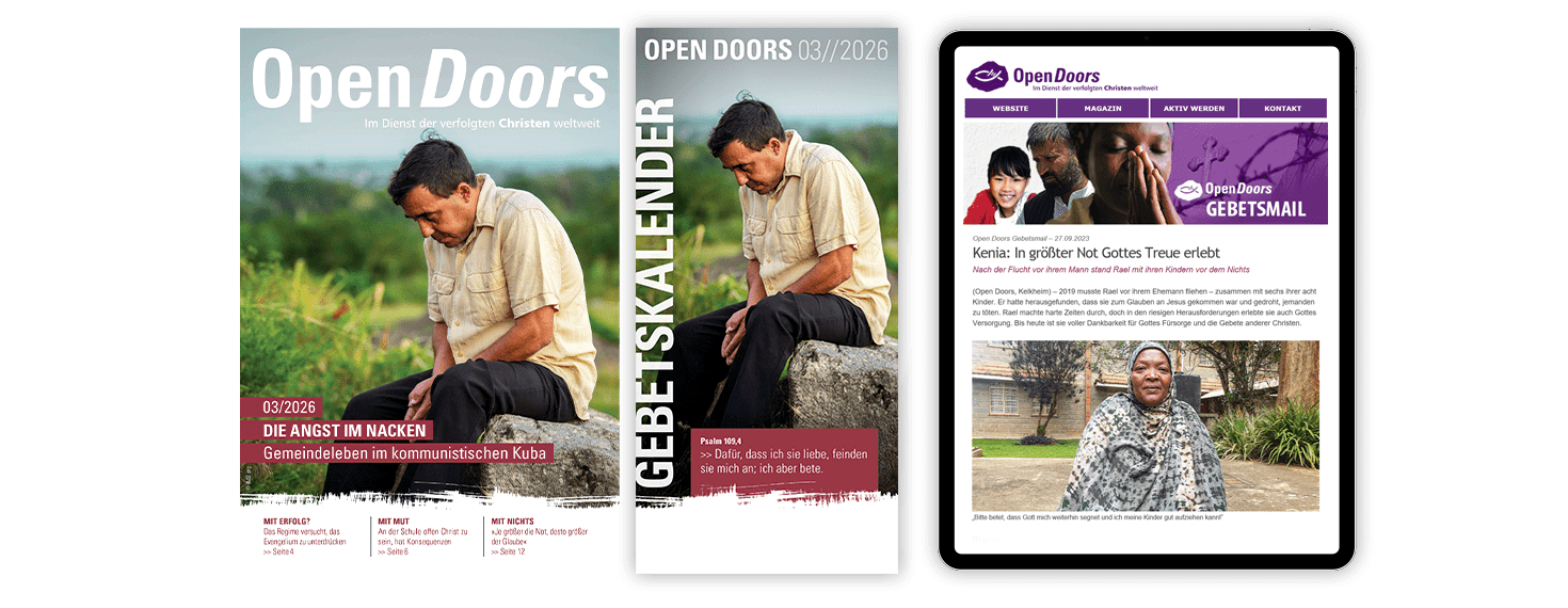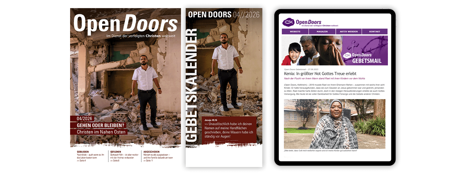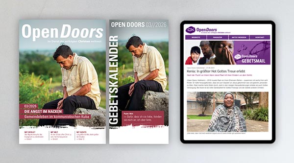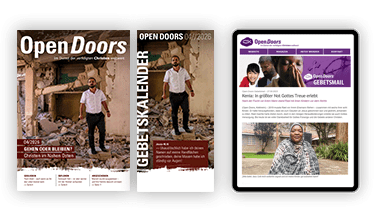 Hier können Sie das kostenlose Monatsmagazin inklusive Gebetskalender mit konkreten Anliegen für jeden Tag und aktuelle Meldungen von Open Doors abonnieren. Weiteres kostenloses Informationsmaterial wie Sonderhefte, Materialien zum Weltverfolgungsindex oder Schreibaktionen können Sie im Gesamt-Bestellformular bestellen.