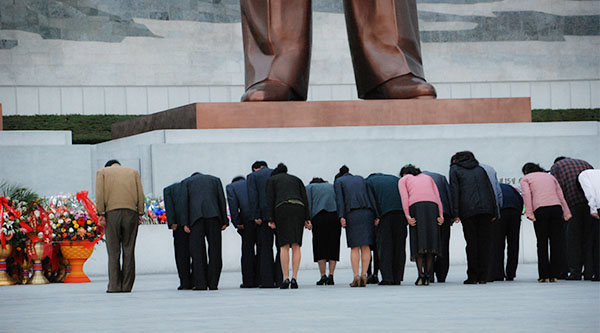 Nordkoreaner müssen sich vor der Statue von Kim Il Sung beugen