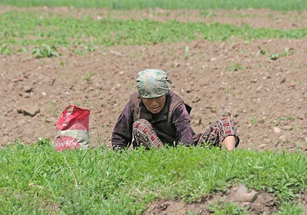 Eine Nordkoreanerin sammelt Gras um daraus eine Mahlzeit zuzubereiten (Archivbild)