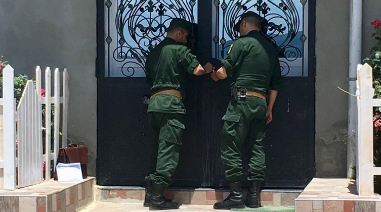 Polizisten versiegeln die Türen der Kirche von Boudjima, einer von über 40 geschlossenen Kirchen des Dachverbandes Evangelischer Kirchen von Algerien (EPA)