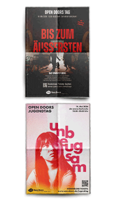 Am 14. Mai 2026 findet der Open Doors Jugendtag statt, am 16. Mai der Open Doors Tag mit Open Doors Kindertag. Nutze dieses Wendeposter, um in deiner Gemeinde oder Jugendgruppe für die Open Doors Tage 2026 einzuladen.