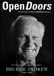 Dieses Sonderheft ist einem Mann gewidmet, der geglaubt hat, dass man Berge versetzen kann, wenn man nur Glauben an einen großen Gott hat. Bruder Andrew, der Gründer von Open Doors, ist am 27.09.2022 im gesegneten Alter von 94 Jahren heimgegangen. Er hat seinen Lauf vollendet und Generationen von Christen geprägt – als Mann des Glaubens, der Bibel und des Gebets.